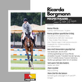 Ricarda ist Teil des Perspektivkaders Springen und ihr Ziel ist es in dieser Saison weiterhin konstant gute Leistungen in S* und S** zu sammeln. Ihr Vorbild ist Marcus Ehning.