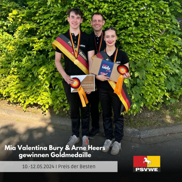 Arne Heers und Mia Valentina Bury gewinnen im Doppelvoltigieren mit Capitano und Longenführer Sven Henze Gold
